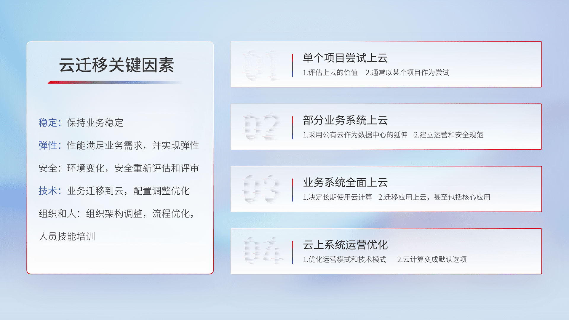 结合实际业务,,,,从规划设计、、云平台选型、、云原生改造、、、数据迁移、、、、集成交付,,,迁移全过程为客户识别最佳上云路径,,做好风险识别管理,,,设计网络架构、、、、身份权限、、安全审计合规、、、、操作审计、、、日志审计、、、、监控告警策略、、多站点容灾设计等,,,,对云上基础设施进行整体规划,,,提升IT治理水平,,,,以满足弹性、、、、高可用、、、、高性能的需求。。。
